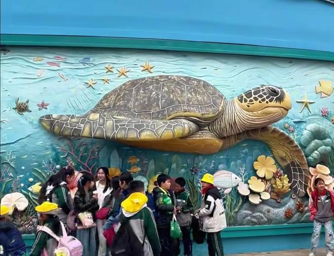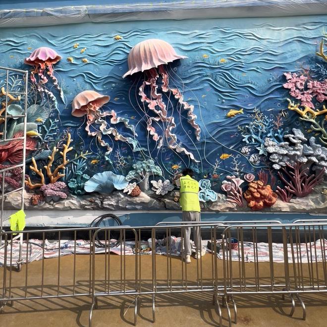 在武汉极地海洋公园,一幅水母珊瑚浮雕壁画是不少游客的拍照打卡点。水母的触手如同丝绸般飘逸,水草仿佛在海水中摆动,半突出的雕塑让整幅壁画给人一种“裸眼3D”的感觉。虽然游客们纷纷拍照,但很少有人会在意这幅画的创作者是谁。