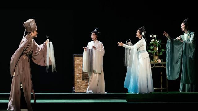 剧中以“梦境叙事”突破传统桎梏,让苏东坡与三位夫人跨时空同框,王弗的聪慧、王闰之的坚韧、王朝云的灵动环绕左右,黑、灰、白三色髯口的交替,悄悄标注着苏东坡的人生起落——黑髯口承载少年伴王弗的锐气,灰髯口藏纳中年与王闰之相守的隐忍,白髯口则流露出晚年同王朝云相伴的通透。当三位夫人的身影渐次消散,苏东坡独自伫立在竹影斑驳的舞台上,“不思量,自难忘”的思念,就藏在每一声深情的吟唱、每一次凝望的眼神里。