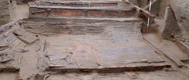 2025年,考古团队在吐鲁番火焰山南麓的一座唐代高等级墓葬发掘时发现了这些彩绘。该墓室内部陈设彩绘木榻、木棺与木骨屏风,其中的木榻与《北齐校书图》中所绘木榻极为相似,是唐墓中罕见的实物原型。