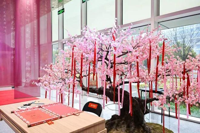 阅剧场外廊咨询台领取“金石不渝 志业同契”专属丝带,写下心愿系于桃花树上,并拍照。