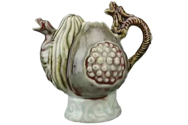 此外,石榴还能与佛手、蜜桃组成象征多子、多福、多寿的“三多纹”。典型器物当属吴文化博物馆的石榴、桃子、佛手饰茶壶。壶身一侧塑有饱满的石榴,表皮凸起的籽粒纹理清晰可辨,釉色呈红褐与灰白之色,晕染自然,另一侧塑成舒展的佛手样式。壶身整体则以丰腴的桃子为基底,粉白釉面映衬出桃尖的淡红色泽,形态鲜活灵动。
