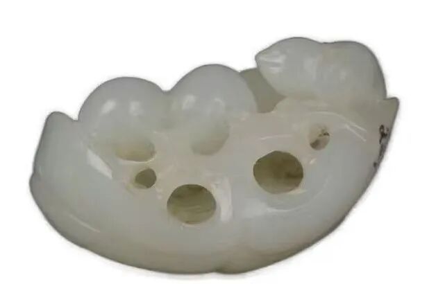 苏州地区常将葡萄纹与其他吉祥元素组合,衍生出更丰富的内涵。比如清代白玉松鼠葡萄饰件,以整块和田白玉籽料雕琢而成,玉质温润细腻。器物采用圆雕工艺,整体呈树叶形制,正面琢刻葡萄一串,藤蔓间镂雕松鼠一只觅食,其目外凸,左顾右盼,呈窥视之态。整器构思精巧,松鼠灵动鲜活,葡萄颗粒饱满。