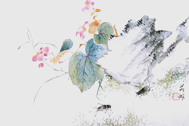 苏州民众亦将螽斯元素融入绘画之中,如翁雒《花石蟋蟀图》便是典型例证。画面下方之蟋蟀,身形小巧灵动,细长纤弱的触角斜向舒展,收拢的翅翼纹理间隐现墨色层次,后腿弯曲蓄势待发,暗藏力道。右侧另一只则体型宽绰,更显悠然闲适,触角向侧方轻展,躯干舒展自如,腿部线条轻缓铺陈。