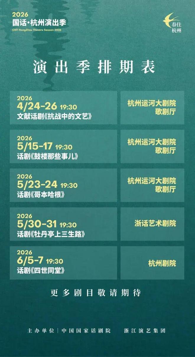 本次2026国话·杭州演出季由浙江演艺集团与中国国家话剧院联合举办,将于2026年4月至6月精彩上演。演出季精选国话近年来多部经典力作,涵盖不同流派、风格与形式,包括文献话剧《抗战中的文艺》、现实主义话剧《鼓楼那些事儿》、思辨经典话剧《哥本哈根》、青春质感话剧《牡丹亭上三生路》,以及老舍先生原著、田沁鑫导演的话剧《四世同堂》等等。