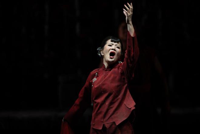 宋元明对九儿的人物塑造十分细腻,也更加注重汉语咬字和中国音乐风格。唱段“红高粱似火炬”中,宋元明的演唱张力十足,唱出了九儿的倔强与不甘;咏叹调“高粱绿了又红”,九儿端着高粱酒祭拜逝去的亲人,把对侵略者的刻骨仇恨转化为复仇的决心,旋律如泣如诉;第八场中,九儿发现鬼子从背后偷袭,飞奔去给兄弟们报信,此段音乐只有一句唱词“占鳌,鬼子从背后来了”反复重复,却是九儿舍生取义时刻最朴素、最动人的表达。