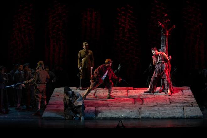 此外,李鳌、朱贺、梁羽丰等歌唱家,在剧中也生动地塑造了不同角色的鲜明特质。梁羽丰边唱边咳,以高密话语调的宣叙调,演活了肺痨病患者单扁郎的形象;自山东的歌唱家李鳌,以地道的山东方言塑造戴老三,用茂腔素材创作的咏叹调“风吹着高粱地”,表达了戴老三接闺女回家的喜悦心情;国家大剧院合唱团在本剧演出中同样贡献了极高的水准,在“红高粱赞美诗”中,合唱团满怀崇敬,为这片土地上的英魂唱出深情的赞美诗。