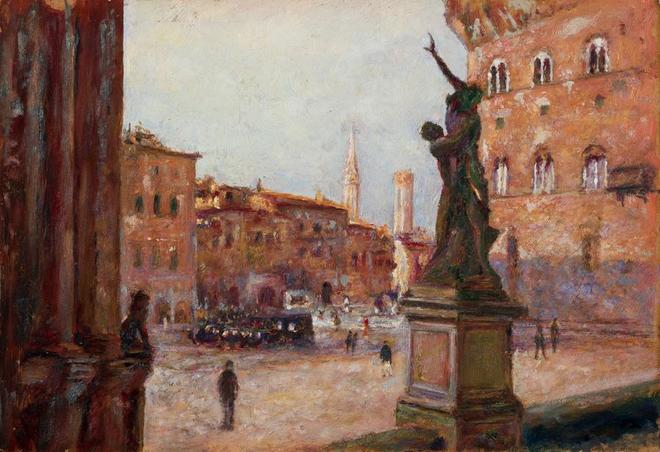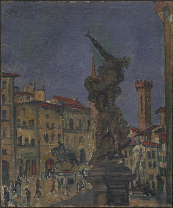 并置展出的作品《翡冷翠》和《佛罗伦萨广场》,让观众尤其能体会两位大师截然不同的艺术理解。这组作品均创作于1930年5月,刘海粟与颜文樑同游意大利的20多天里。当时,他们面对佛罗伦萨同一视角下的广场与雕塑,各自用画笔记录眼前所见。《翡冷翠》出自刘海粟,有着灿烂的光线,浓郁的色彩。《佛罗伦萨广场》出自颜文樑,尺幅几乎只有前者的四分之一,呈现出一种温柔的轻盈。两人一动一静、一放一收,以各自不同的精彩共同书写了中国艺术对话世界的最初篇章。