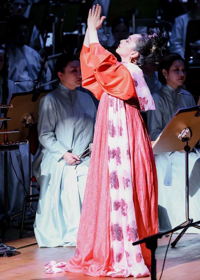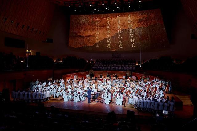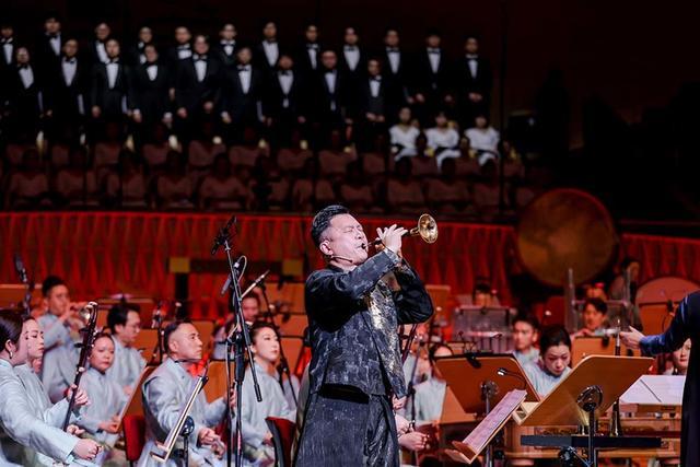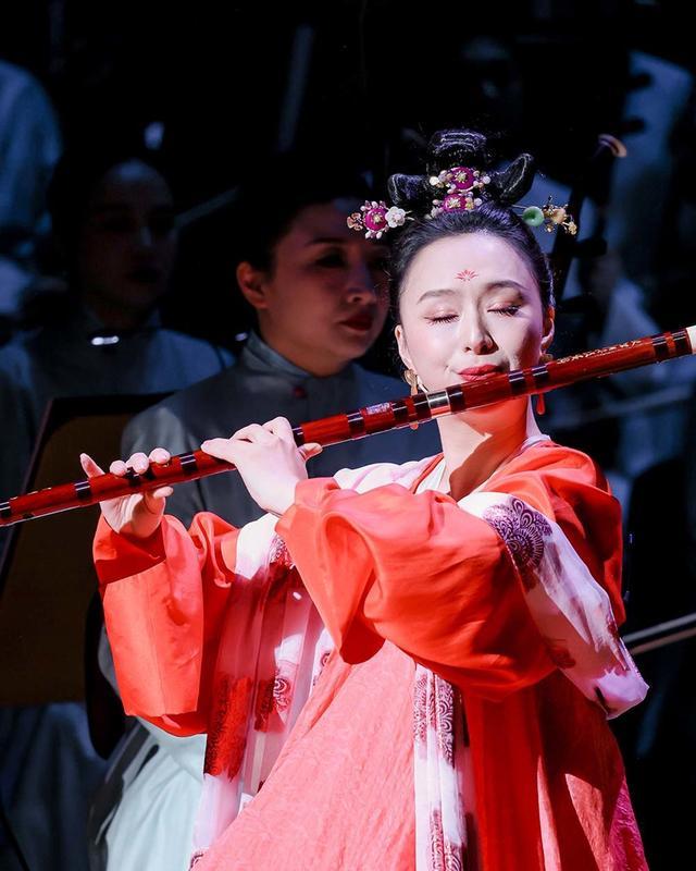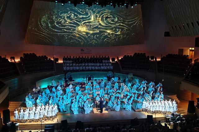 从二度创作来看,指挥姚申申完全把握住合唱与乐队的声部平衡,将“万物生息”的万籁俱寂到“星河共潮”的色彩斑斓,表现得淋漓尽致。几位独奏家贡献了全情投入、极为精湛的演奏水准,无论是化身岳飞吟诵《满江红》的唢呐演奏家胡晨韵,还是情真意切的琵琶演奏家俞冰、激情澎湃的打击乐首席王音睿,尤其是笛箫演奏家赵韵梦在《霓裳羽衣曲》款款舞动,如同壁画中走出来的飞天,令人眼前一亮。