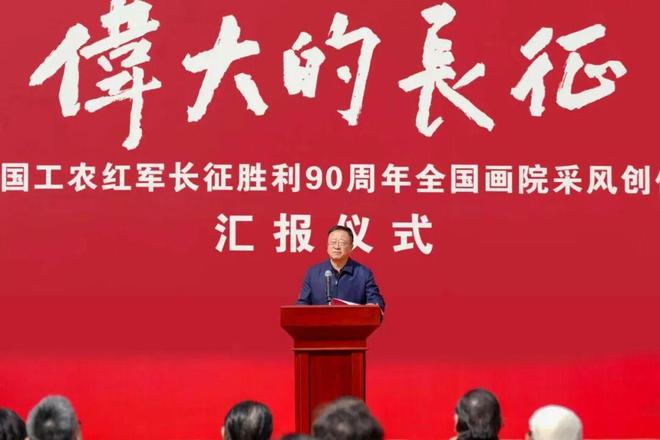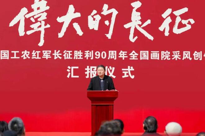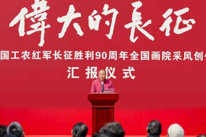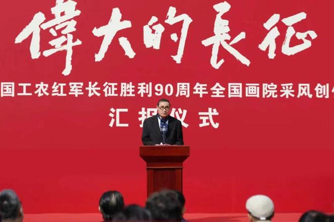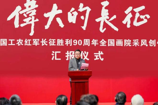 刘万鸣在致辞中首先代表中国国家画院,向给予本次活动大力支持的延安市委、市政府及各级文化单位,向热情接待的老区人民,向潜心创作的全体艺术家致以最衷心的感谢。他表示,四个采风团历时10天,跨越10余个省区,沿着红军当年的足迹,完成了一场深刻的艺术朝圣之旅。围绕活动初衷,刘万鸣总结了三点核心收获:一是坚守初心,在历史现场感悟精神伟力。艺术家们通过实地丈量历史,在长征沿线将“革命理想高于天”的信仰,转化为深刻的精神体验;二是深耕学术,在行走的课堂中锤炼创作品格。依托专家精心遴选的写生点,艺术家们在行走中锤炼技法,力求用新时代的艺术语言重塑长征之魂;三是扎根人民,在鱼水情深中厚植家国情怀。艺术家们通过深入村落倾听红军故事,将质朴的群众情感融入创作,确保作品有温度、有根基。刘万鸣表示,今天的汇报仪式并非终点,而是一个崭新的起点。采风写生的结束,意味着创作高潮的开始。希望大家把在长征路上收获的感动与感悟带回画室,沉淀为创作的激情与灵感,力争推出一批兼具思想深度与艺术高度的精品力作,讲好长征故事,为纪念长征胜利90周年献上一份庄重的艺术答卷。