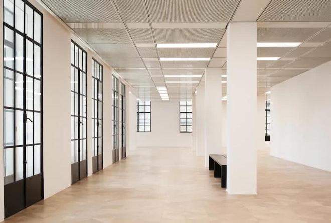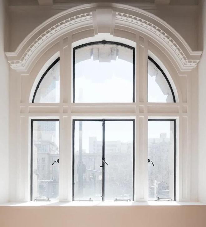 步入场馆,一扇镶嵌于黑色门框的老钢窗静立眼前,其形制与建筑立面的老钢窗遥相呼应。澎湃新闻了解到,gmp设计团队以“对历史的尊重”为此次空间焕新的主旨。在空间清理的过程中,窗洞周边精美的历史窗套得以重现。设计方对不同时期留存的窗套、各异的窗户划分方式原貌保留。而地面则是延续建筑记忆的重要载体,设计团队翻阅尘封的历史档案,为新馆铺设了外滩同期历史建筑的经典拼花实木地板。同时,美术馆恪守建筑原有的回字形动线,让空间的游览节奏契合老建筑的肌理。