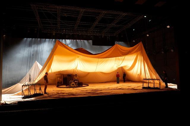 全剧的舞台设计简到极致:四位演员、一位打击乐手,一块巨大的白布,便撑起了全部的表达。这块白布是舞台的灵魂,也是蒂亚戈设置的“距离的媒介”。它时而如战地的帐篷连绵起伏,承载着冲突地区人们的苦难与希望;时而如山丘般沉默矗立,象征着战争的沉重与不可逾越;时而又化作遮蔽与揭示的帷幔,一点点揭开人道工作者的坚守与挣扎。白布的每一次起伏、每一次变换,都在无声地诉说着战争的残酷,比任何刻意的渲染都更具冲击力,让观众直观地感受到战争对生活的撕裂。