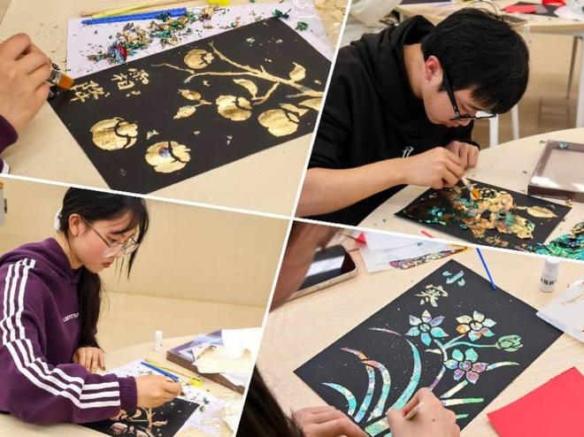 金箔画制作现场气氛热烈。师生静心创作,在底板上大胆构思,轻贴金箔、精心修饰。古老技艺与青春创意碰撞,指尖折射出金色光华,传统非遗在新时代焕发鲜活生命力。