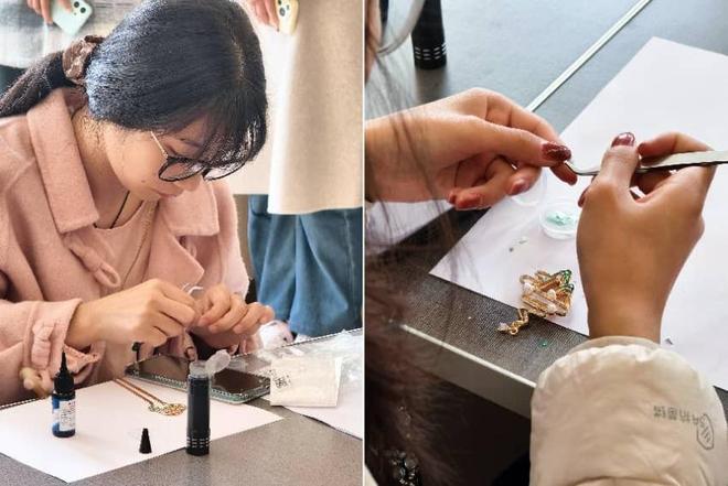 掐丝珐琅体验区尽显“慢工出细活”的匠人精神。师生用镊子将纤细金丝弯折勾勒,描摹纹样轮廓,再逐层填充釉料。从起稿到掐丝、点蓝,全神贯注间,传统工艺的严谨与匠心悄然根植心间。