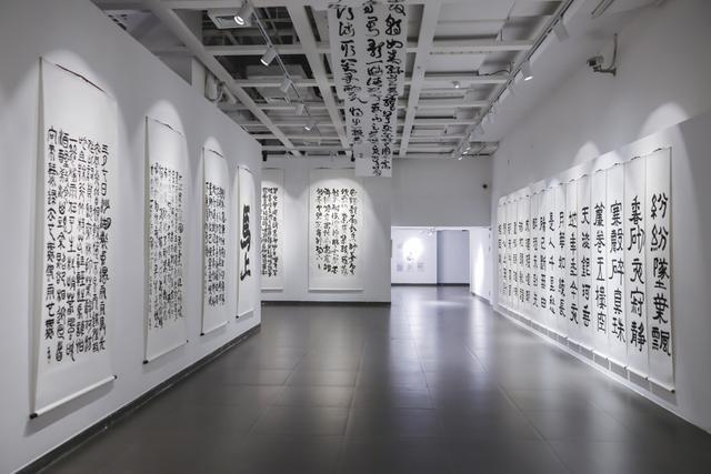 从长达5米的楷书长卷《宣示表》,到气势恢宏的15米巨幅布面书法《将进酒》;从六尺对开16条屏隶书《御街行》、32条屏草书《黔之驴》,再到八尺全开的篆、隶、草书等大幅作品,都展现出惊人的气魄。现场还展出了多幅花鸟、写意等水墨国画。这些作品虽带有孩童特有的稚嫩,却透着一种未经雕琢的、属于孩子的生动与“拙趣”。