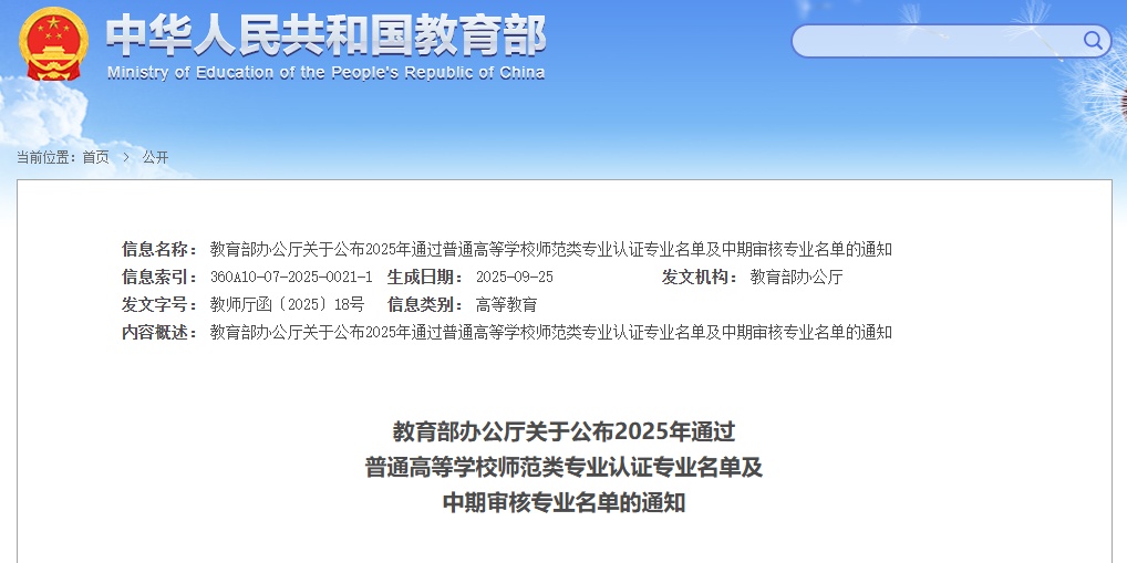 近日,教育部办公厅发布《关于公布2025年通过普通高等学校师范类专业认证专业名单及中期审核专业名单的通知》。
