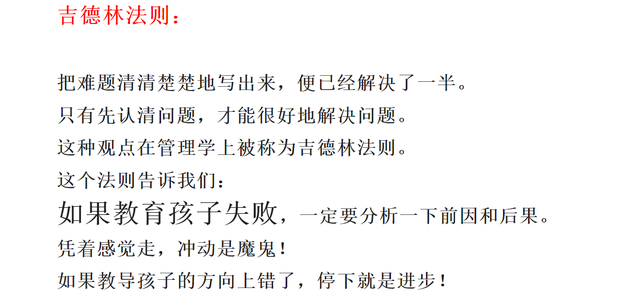 管理学上的“吉德林法则”告诉家长们,只要把孩子出现的问题清楚些出来,就已经解决了一半。