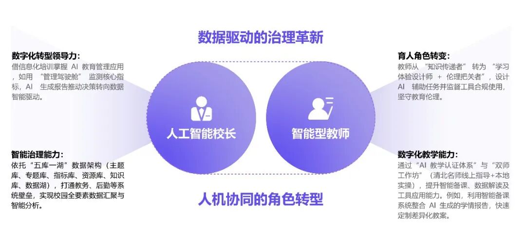 在这一进程中,华领通智正以系统化方案助力校长的智能化转型。以“教育为本、智能为用”为原则,华领通智提出“提升两支队伍建设”,其中针对校长侧重点是建设人工智能校长体系——通过数据决策平台与AI治理工具,帮助校长提升数字化领导力与系统化管理能力。 这种实践并非追求技术炫示,而是让AI回到教育逻辑中:以数据支撑判断、以智能提升治理、以科技服务人的成长。