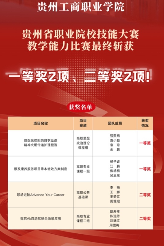 近日,由贵州省教育厅主办的贵州省职业院校技能大赛教学能力比赛落下帷幕。贵州工商职业学院派出的4支教师团队凭借出色的教学能力和创新的教学方法,在全省决赛的84支队伍中脱颖而出,最终斩获一等奖2项、二等奖2项的优异成绩。