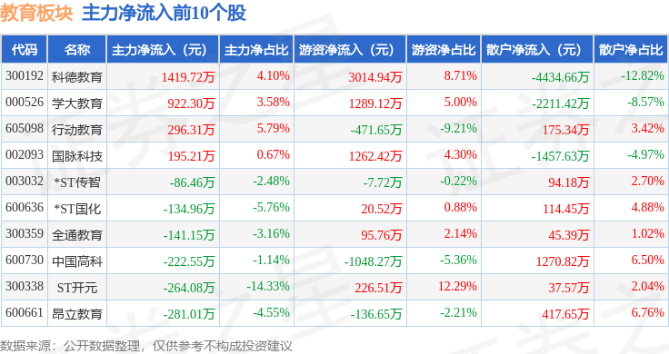从资金流向上来看,当日教育板块主力资金净流出1.21亿元,游资资金净流入7650.82万元,散户资金净流入4447.22万元。教育板块个股资金流向见下表: