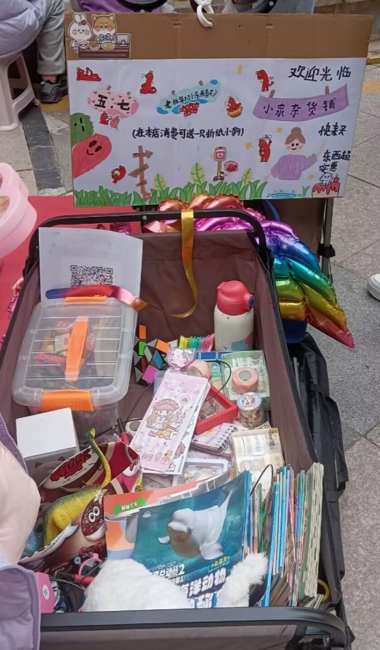 在祥泰新河湾社区广场,跳蚤市场活动率先拉开帷幕。孩子们化身“小掌柜”,将家中闲置的绘本、玩具、手工饰品等精心陈列,创意十足的宣传海报吸引了众多社区居民驻足。“阿姨,欢迎光临!消费可赠送手工折纸小狗哦!”稚嫩的吆喝声此起彼伏,孩子们主动与顾客沟通议价,在买卖互动中锻炼社交能力与财商思维。此次跳蚤市场不仅实现了闲置物品的循环利用,更搭建起邻里互助的温情桥梁,让“资源共享、友善互助”的理念在实践中扎根。