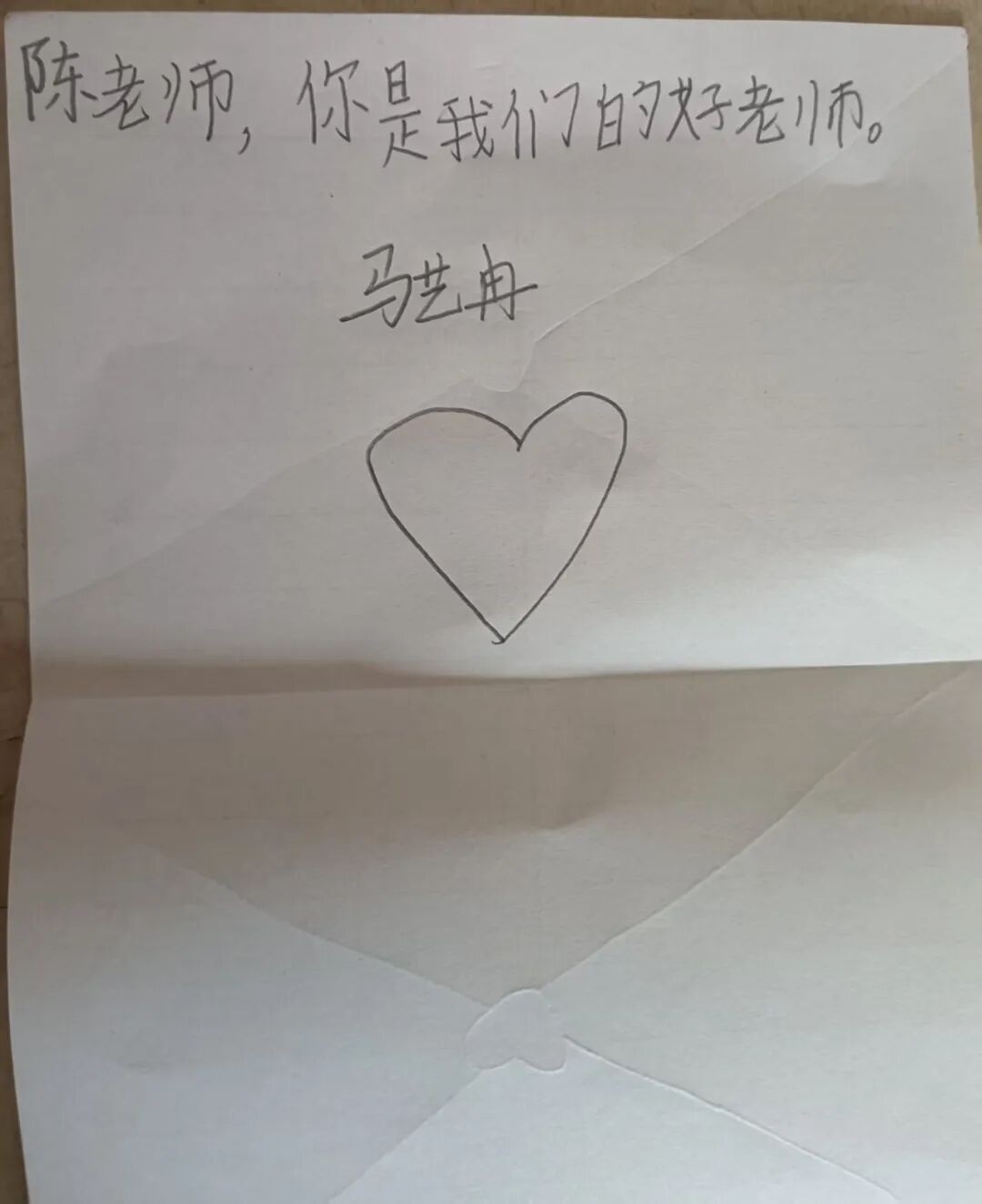 接过这封特别的信,我仔细端详。普通的作业纸被整齐对折,封面用铅笔画了一颗饱满的爱心,展开内页,稚嫩的铅笔字映入眼帘:“陈老师:您是我们的好老师!——马艺冉”简简单单一句话,顿时让我陷入了孩子柔软的内心世界里。