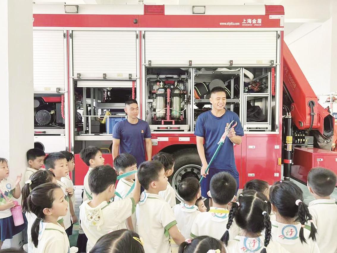 站内整齐排列的红色消防车则牢牢吸引了孩子们的目光,在消防员的带领下,孩子们认识了水罐消防车、云梯消防车等不同车型的功能。最让孩子们兴奋的是,他们轮流登上消防车,戴上消防头盔,亲身体验了一把当“小小消防员”的威风。