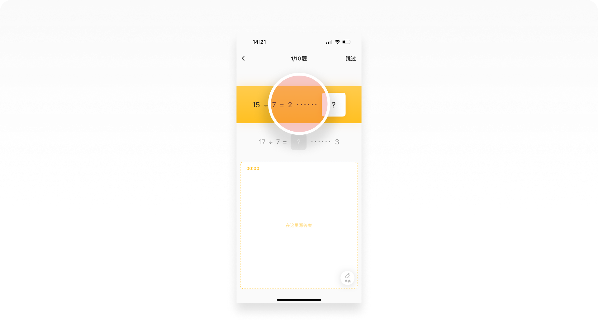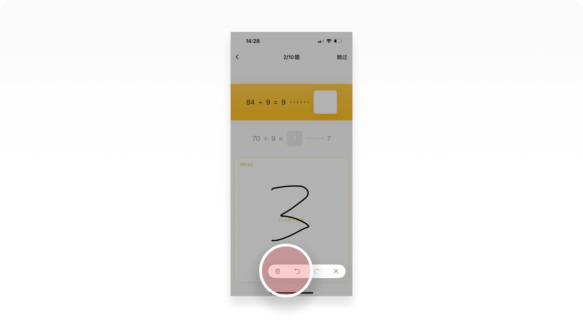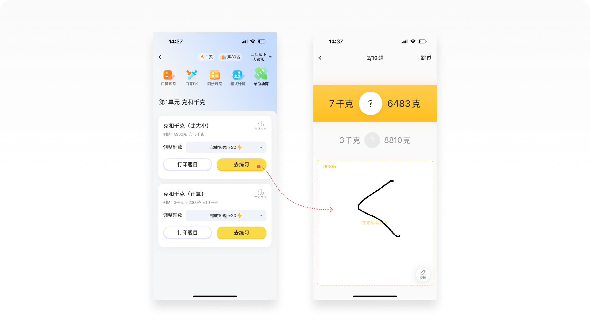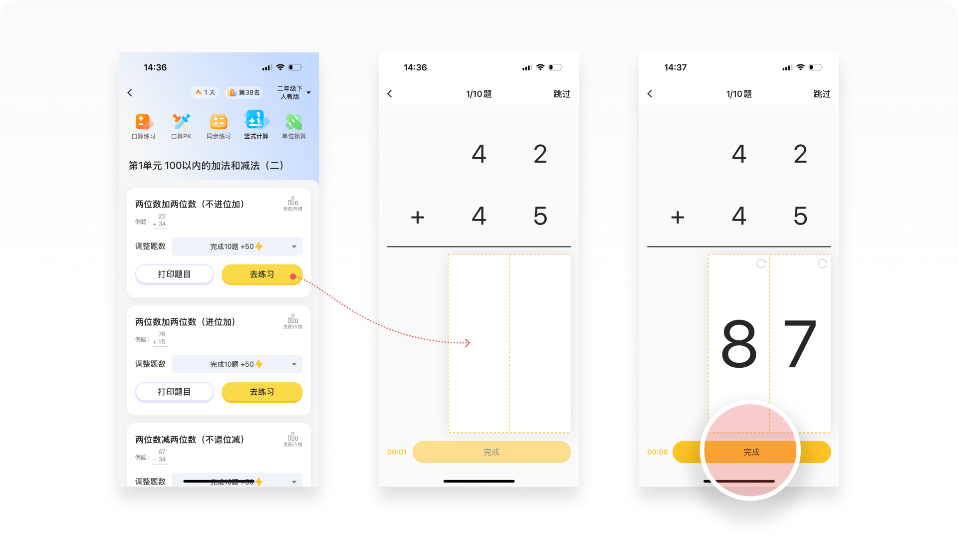 虽然都是手写练习,但两个题型之所以出现交互形式的区别是因为他们的练习目标不同。口算练习侧重于培养用户的口算能力,更注重口算效率,而竖式计算侧重于做题的细节和过程,所以用户有足够的时间检查无误以后再跳转到下一题。
