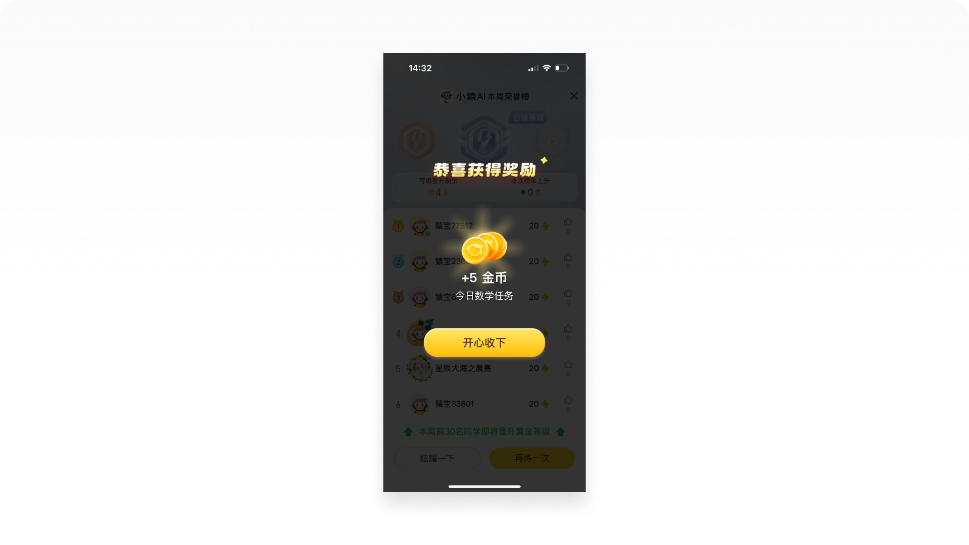 在用户完成练习以后,系统会先跳转到排行榜页面,告知用户在系统当前的练习排名。关于排行榜,小猿AI设计得非常用心,我们拆分一下它的设计细节。