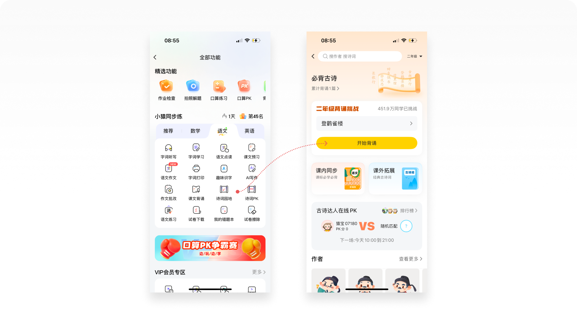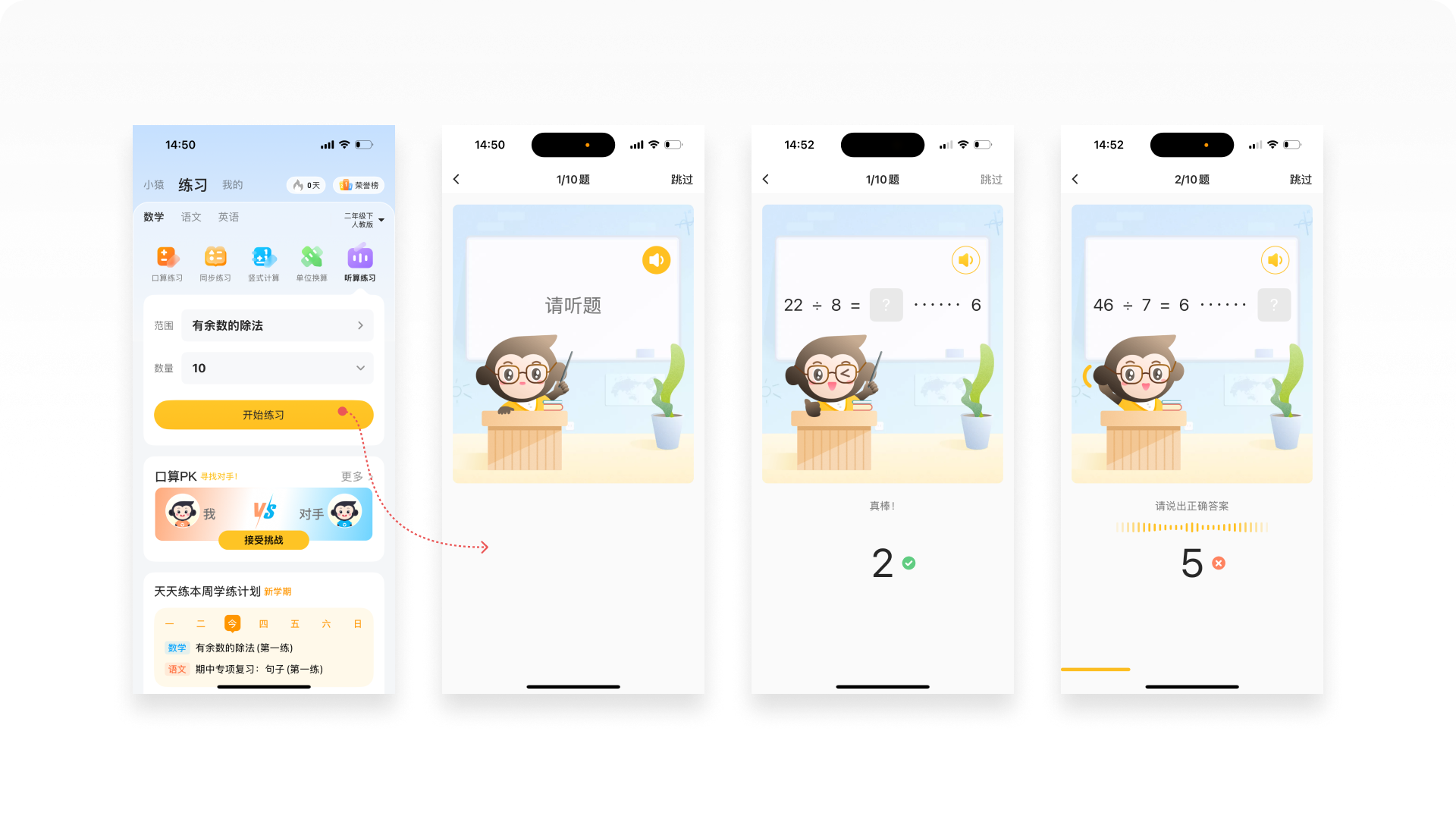 口算练习和竖式计算采用手写形式与产品交互,而听算练习和背古诗则通过语音形式交互。这些创新的设计方式不仅新颖,还让学习过程更加有趣。