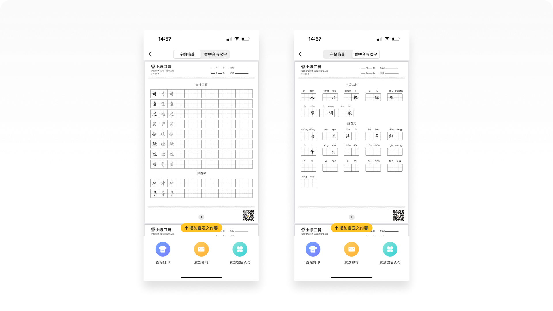 打印:选中课文,点击打印,就能进入到打印详情页,还可以选择字帖临摹和看拼音写汉字两种模式。