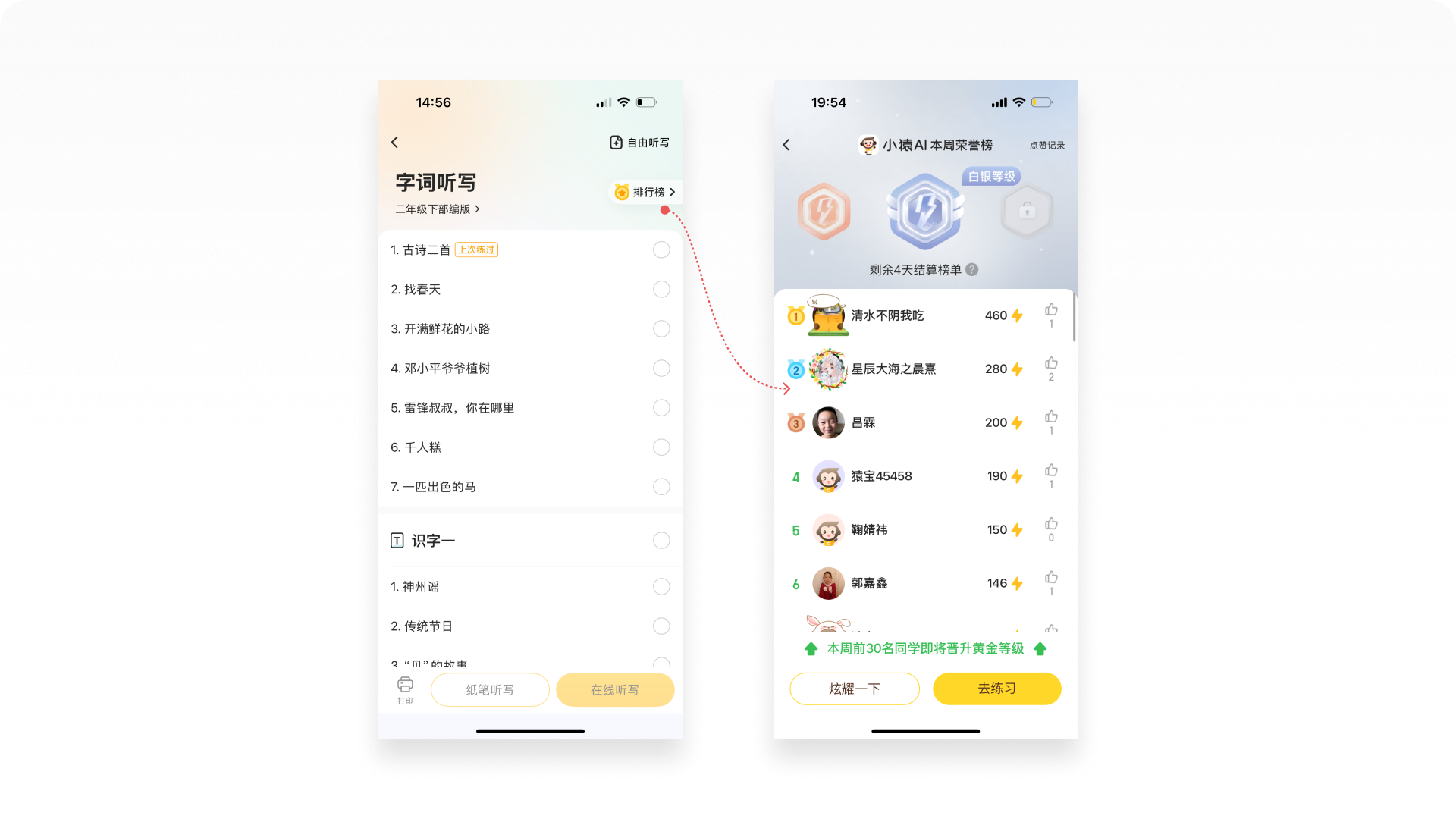 听写完成后,系统会赠送虚拟金币和积分奖励,并更新用户在当周的字数统计排行榜。