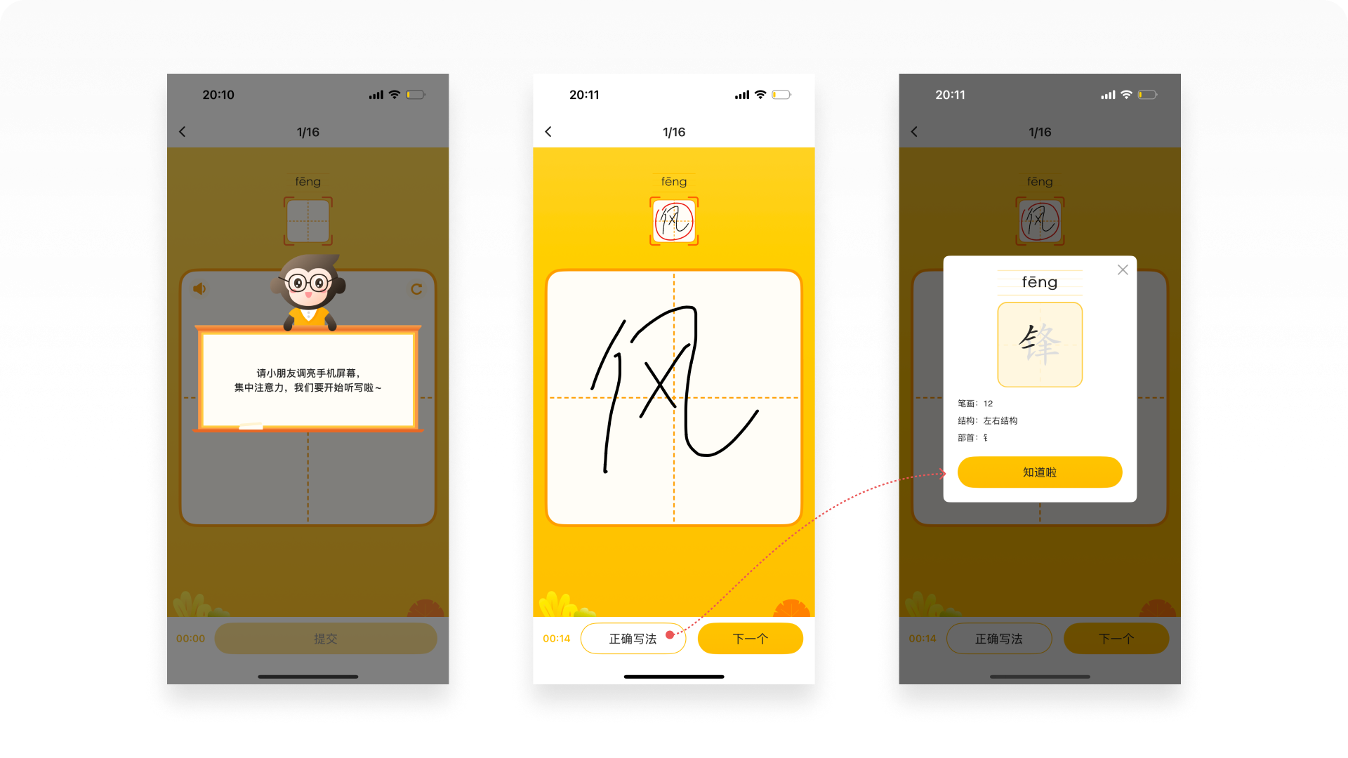 反馈:当用户的答案输错,系统会提示正确写法,而且严格监督用户的书写笔顺。