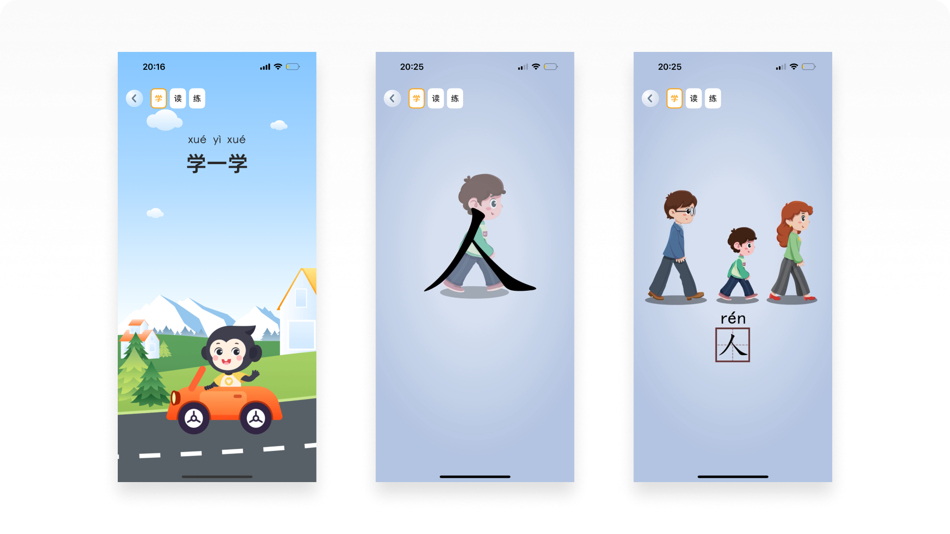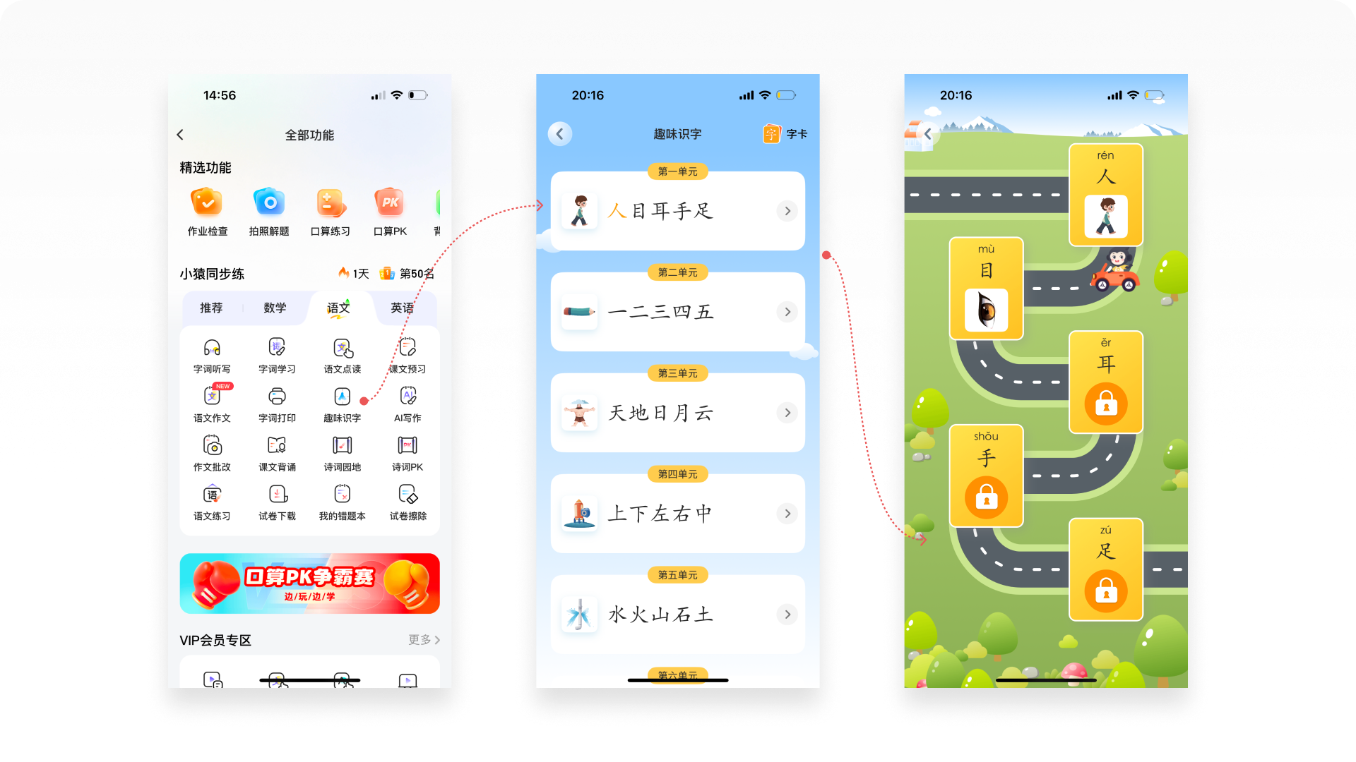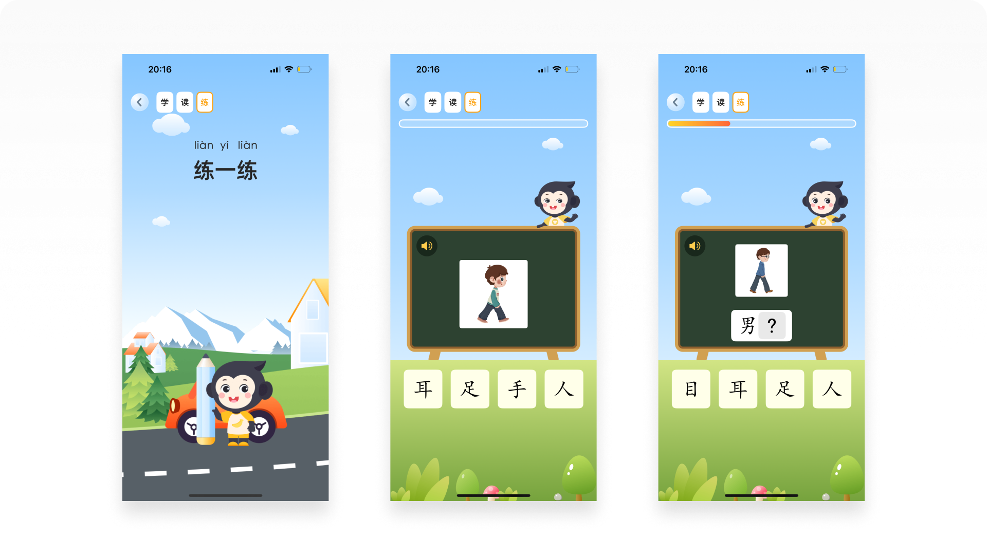 趣味识字按课本的单元划分,逐字学习通过后解锁下一个单词。这是一个综合题型,分为学、读和练三个部分。