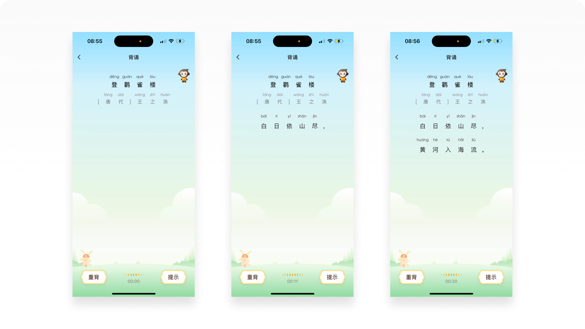 进入「诗词园地」,点击开始背诵,就能进入到背古诗的题型练习。