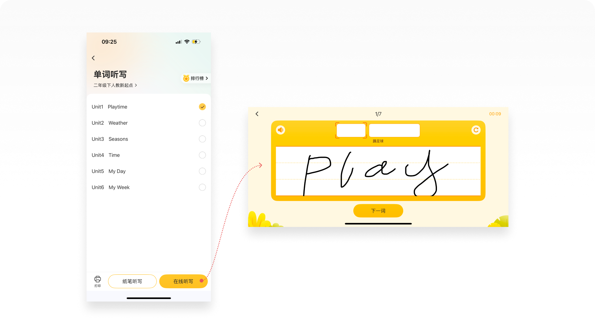 单词听写的交互逻辑和语文的字词听写一样,支持纸笔听写和在线听写两种模式。唯一的区别是由于英文的字符数过长,进入听写后,手机会自动横屏显示。