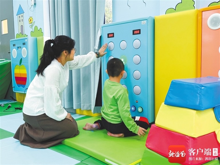 在唱游律动室,一年级教师王轩轩带着唐氏综合征患儿亮亮随音乐互动,训练注意力和控制力。海南日报全媒体记者 刘宁玥 摄