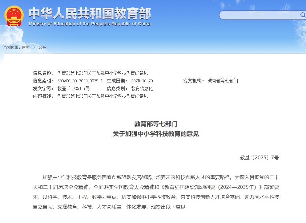 教育部等七部门发布关于加强中小学科技教育的意见。图/教育部官网截图