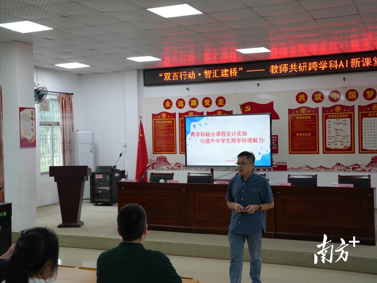 本次活动核心环节为陈韶光带来的《跨学科融合课程实施与提升学生跨学科理解力》专题讲座。结合当前中小学的教学实际,陈韶光从理论与实践双维度展开分享:首先解读跨学科理念内涵,明确其作为跨学科主题学习的指导框架价值;随后分析小学跨学科教学研究现状与发展趋势,提炼STEAM视角下的核心设计原则;最后重点阐述“人文引领,科技赋能”双轮驱动的教学设计模式,展示了南武中学“学创空间”的课程体系,通过“纸桥+承重项目”“岭南特色建筑研究”等项目学习内容,拆解应用步骤与关键要点,让在场教师直观掌握跨学科教学的实操方法,并鼓励构建“双师课堂”教学模式,通过整合“校内双学科导师”与“人机协同”双线机制,以突破学科壁垒,实现跨学科协同教学。