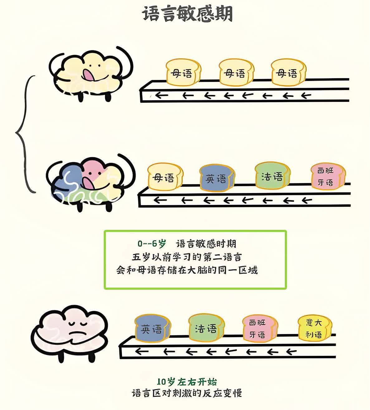 一般来说,孩子的语言敏感期开始于2至3岁,止步于12岁左右。但真正的语言发育高峰期,其实是2至6岁之间。