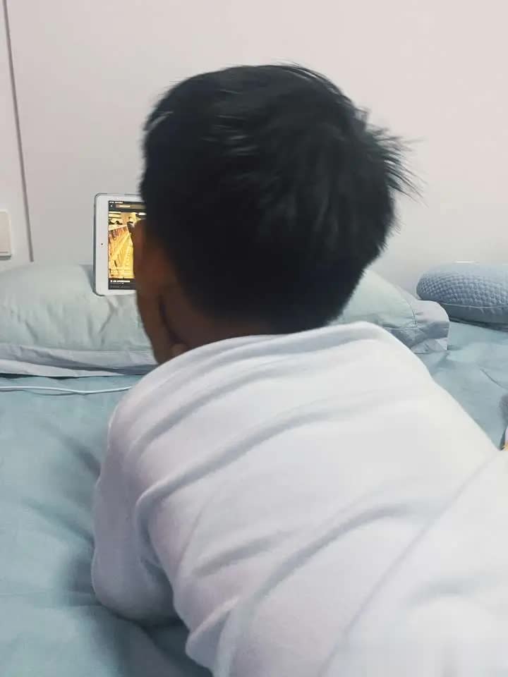 晚上9:00,他洗刷完上床,拿出iPad要看短视频,我知道他一天都在外面玩儿,除了上网课以外都没看电视,所以他想看就看吧,半小时之后他会自己关掉。