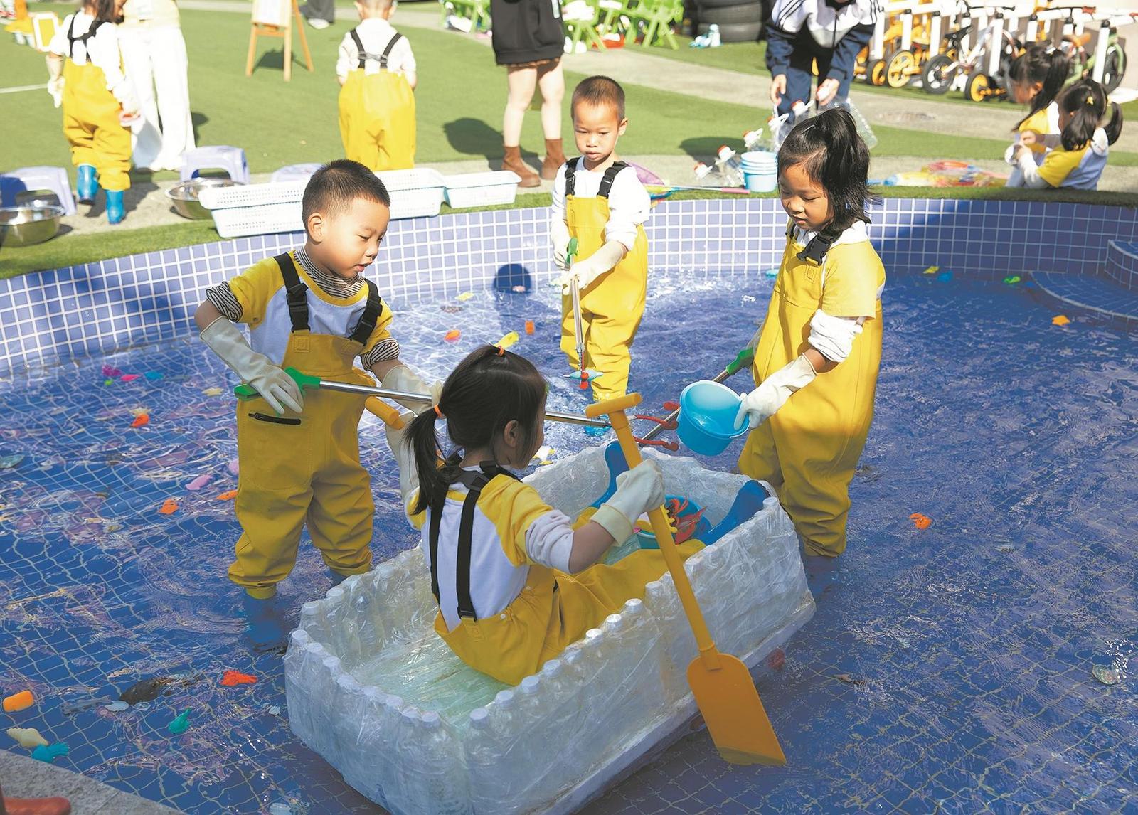 幼儿在快乐玩水区协作完成打捞任务(学校 供图)