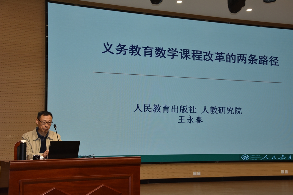 王永春教授围绕三节课例展开精准深入的点评,同时带来《小学数学新教材与教学改革》专题分享。他强调,新教材以核心素养为引领,着重关注情境搭建与探究式学习,积极倡导“用中学、创中学”的教学理念,助力教学实现从“以教为主”到“以学为中心”的转变,切实让学生成为学习的主体。