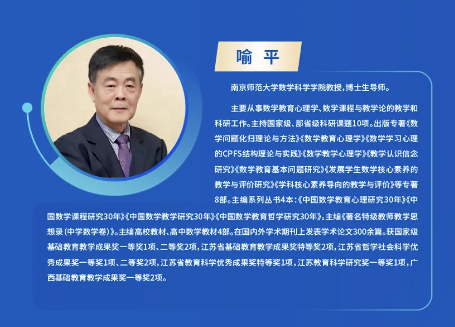 喻平教授主要从事数学教育心理学、数学课程与教学论的教学和科研工作。主持国家级、部省级科研课题10项;主编高校教材、高中数学教材4部。