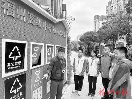 在福州高级中学,每隔一段时间,学校就会利用劳动课、班会课,分批组织同学们走出课堂,借助校园里的生活垃圾分类屋开展实操实训,让“垃圾分类”的自觉意识落地。同时,还鼓励学生化身社区“小小劝导员”,参与志愿服务,构建起“课堂—校园—社区”三维育人体系。