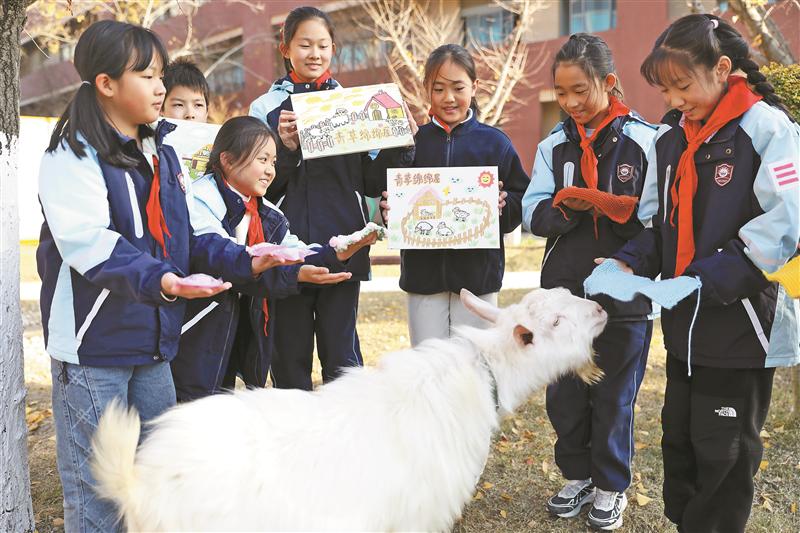 学生与山羊的温馨互动,构成了一个个连接课堂与生活、知识与情感的真实教育场景。围绕山羊饲养这一主题,结合学校课题“‘快乐童年’学生自发型微课程群开发研究”,师生已经自主开发出“智慧主播——我为产品来代言”等微课程。接下来,学校会把为山羊搭建新羊圈作为重点任务,融入相关学科知识以及劳动教育、工程教育等内容。