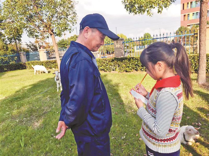“陆师傅,请问我们该给山羊吃什么?”“什么行为对山羊来说比较友好?”午后的校园草坪上,新吴实小学生围着学校的后勤保障人员兼饲养员陆文龙询问各种关于山羊的饲养问题,并认真记录着。一旁,3只山羊正在草坪上吃草、晒太阳。这样温馨、有爱的画面已然成为新吴实小的校园日常。