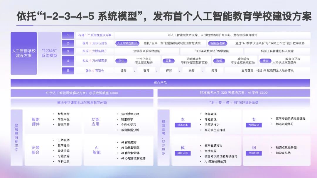 正是在这一背景下,华领人工智能集团提出“人工智能教育学校建设方案”,以“1-2-3-4-5 系统模型”为框架,为基础教育构建起一套面向结构能力、思维生成与系统诊断的智能化支持路径。方案以“师—生—机协同”重构学习过程,使课堂从线性讲授走向结构化生长,使知识从碎片呈现走向关联生成,使学习从静态结果走向可观察、可诊断的动态过程。