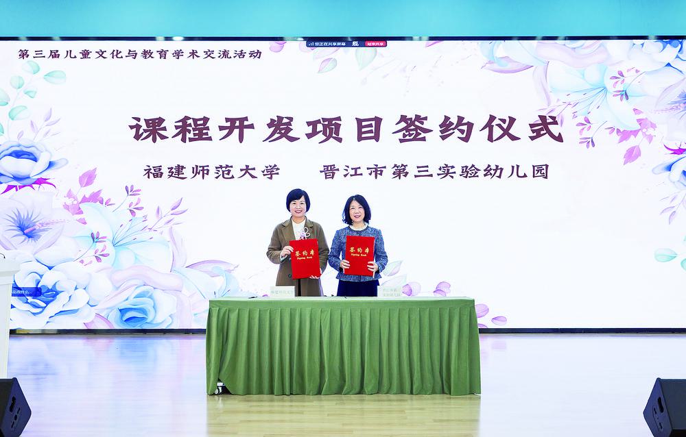 本届论坛以“文化传承与课程创新”为主题,聚焦优秀在地文化如何从静态资源转化为可教、可学、可创的课程实践。活动期间,福建师范大学与晋江市第三实验幼儿园签署课程开发项目协议,后续将梳理本地幼儿园课程建设的地方资源、实践经验与现实困境,指导教师创设具有区域文化特色的主题环境及其相应物理空间和环境材料,推动在地文化资源与幼儿园课程建设的系统化融合。