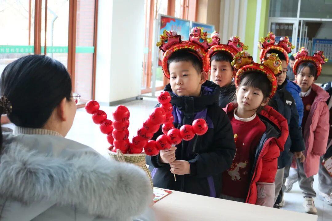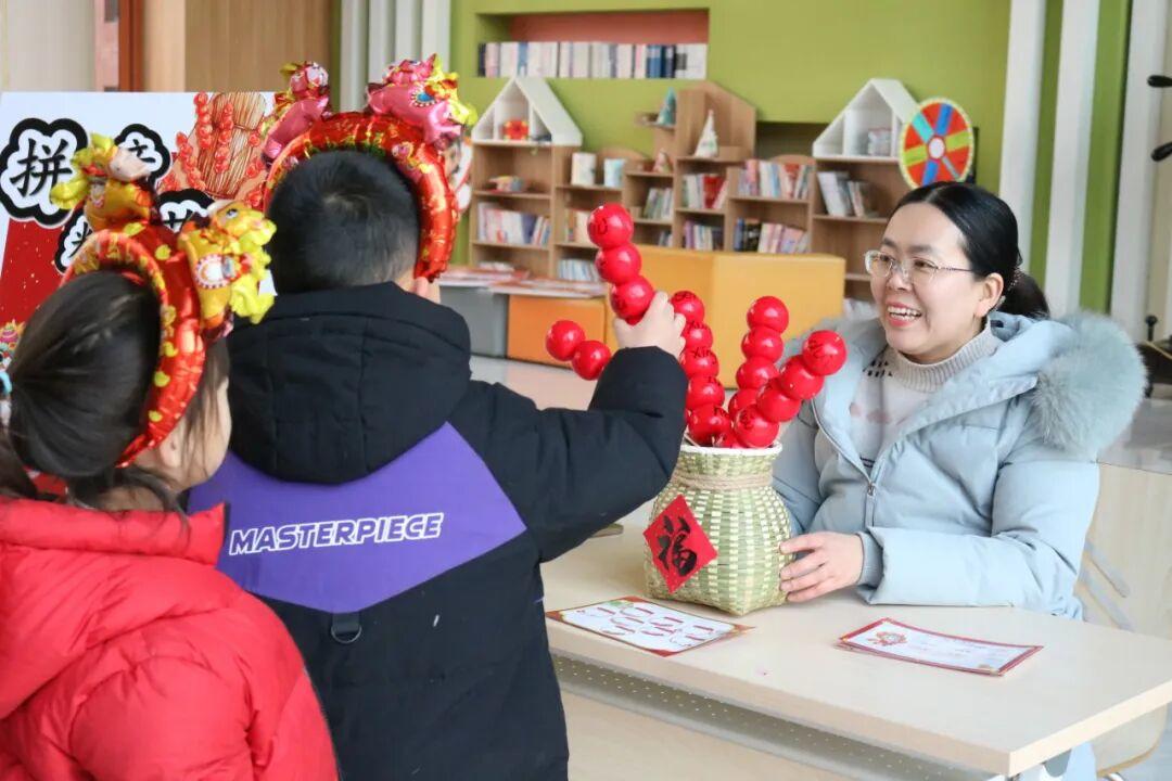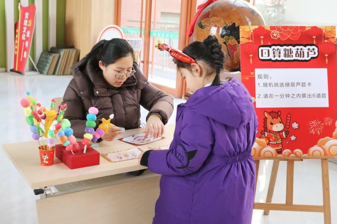 活动现场精心布置多个童趣闯关站点,“字词对对碰”“口算糖葫芦”“诗韵转盘”“年货巧分类”等关卡各具特色,将学科知识巧妙转化为游戏任务。孩子们化身勇敢“小马”,手持闯关卡兴致勃勃穿梭其间。语文关卡中,大家抽取词语卡片准确认读、搭配,声情并茂背诵指定篇目,展现扎实积累;数学关卡里,面对糖葫芦造型的口算题沉着应答,灵活完成图形拼搭与年货分类任务,在实操中检验知识运用能力。