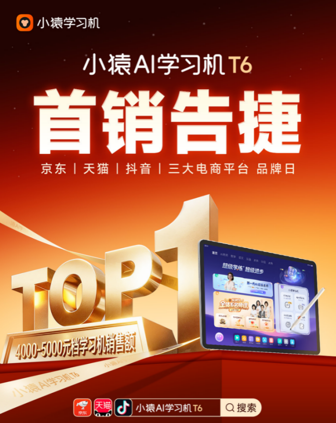 3月29日,刚刚发布的小猿AI学习机T6迎来品牌日,凭借强劲的市场表现一举斩获京东、天猫、抖音三大主流电商平台4000-5000元档学习机销售额第一名,成为该价格段内最受消费者青睐的学习机产品。这一成绩不仅彰显了T6学习机强大的产品力,也进一步印证了市场对AI赋能学习效果提升的普遍认可。
